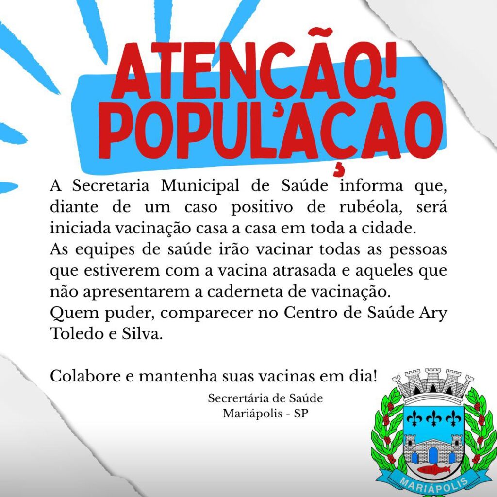 A Secretaria Municipal de Saúde de Mariápolis informou que foi confirmado um caso positivo de rubéola no município. Diante da situação, será realizada uma ação emergencial de vacinação casa a casa em toda a cidade.