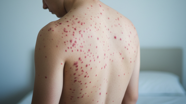 - Manchas avermelhadas na pele (exantema), que começam no rosto e se espalham pelo corpo;